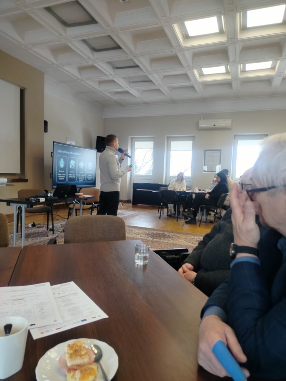 Kolejnym elementem spotkania było wystąpienie Pana Piotra Szelkowskiego, który jest zawodowym aktorem teatralnym i filmowym, certyfikowanym trenerem metody DISC®, storytellingu i komunikacji oraz wykładowcą MBA, łączącym metody aktorskie, narzędzia DISC® i AI w pracy edukacyjnej i doradczej. Zaprezentował w swoim wystąpieniu rolę, znaczenie głosu, emocji i autentyczności w metodzie storytellingu, które pomagają uczniowi otworzyć się i mówić bez lęku o swoich obawach. W debacie warsztatowej zademonstrował jak opowiadać isłuchać, aby rozmowa doradcza prowadziła ucznia do refleksji, a nie do gotowych odpowiedzi. Pokazał również jakie zasady i elementy komunikacji należy uwzględnić w przygotowaniu scenariusza i realizacji rozmowy doradczej. Omówił także schemat procesu komunikacji i jego praktyczne wykorzystanie w procesie przekazywania informacji. Podkreślił znaczenie i rolę empatii doradcy zawodowego w komunikacji werbalnej i niewerbalnej z uczniem. Kończąc prelekcję zaprezentował technikę S.Ex.I - i jej trzy sekcje: Statement (twierdzenie) gdzie formułujemy tezę, do której chcemy przekonać słuchaczy, Explain – wyjaśnienie, które jest logicznym wywodem przyczynowo – skutkowym przekonującym odbiorców do przedstawionej tezy i Illustrate czyli uwiarygodnienie poprzez badania i naukowe źródła przekazanych informacji.