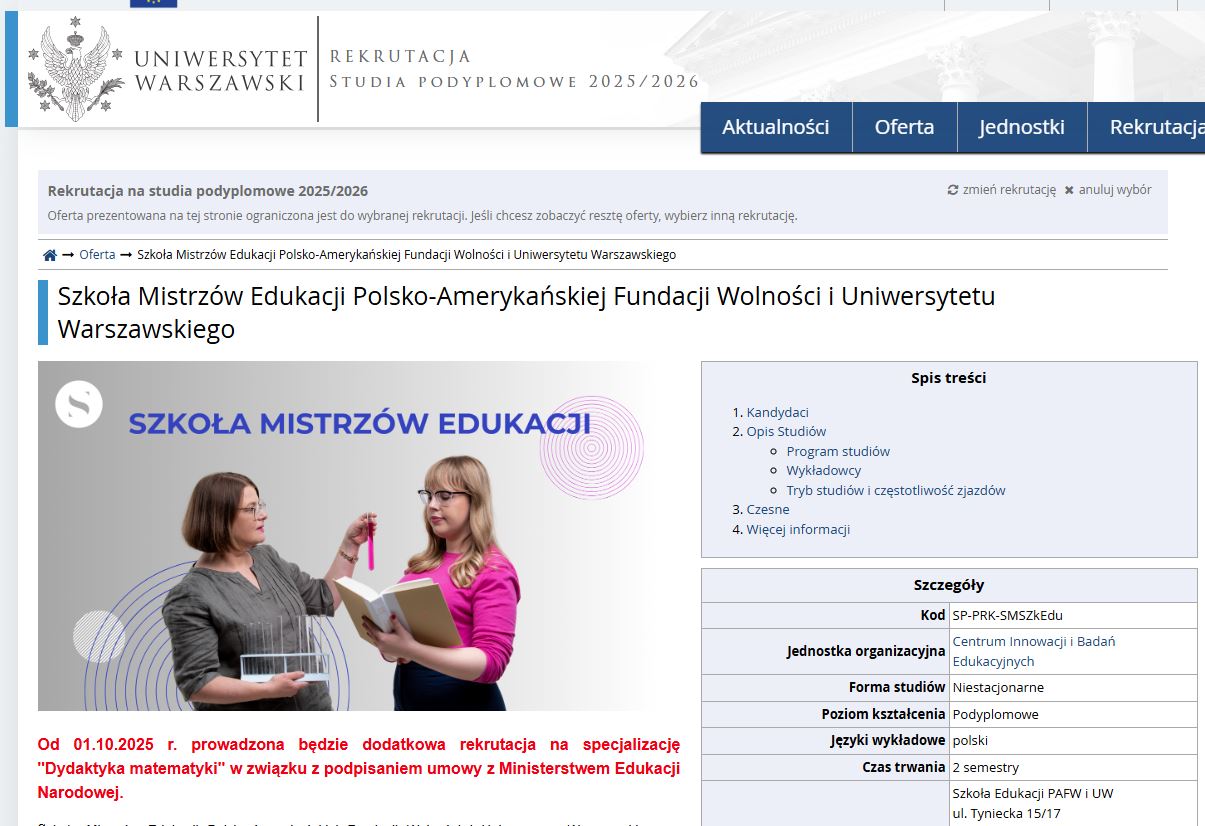 Studia poprowadzi Szkoła Edukacji Polsko-Amerykańskiej Fundacji Wolności i Uniwersytetu Warszawskiego. Ogłoszony został nabór dla nauczycieli matematyki klas 4–8 szkoły podstawowej.