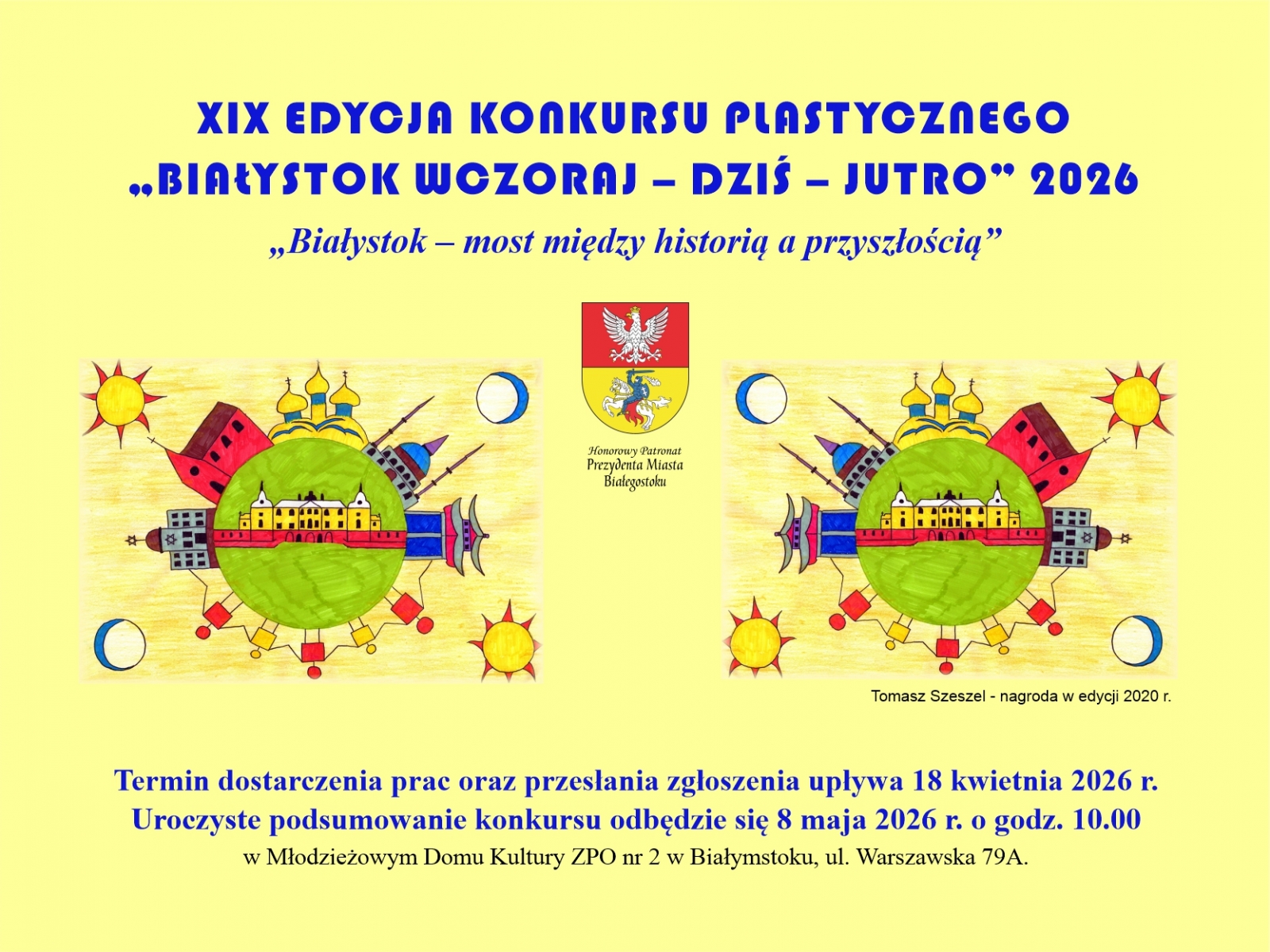 Serdecznie zapraszamy do udziału w XIX edycji konkursu plastycznego „Białystok wczoraj-dziś-jutro" 2026 ph. „Białystok – most między historią a przyszłością". W konkursie mogą wziąć uczniowie wszystkich typów szkół, uczestnicy zajęć placówek oświatowo-wychowawczych oraz placówek prowadzących zajęcia pozalekcyjne.